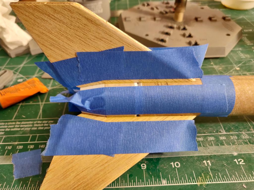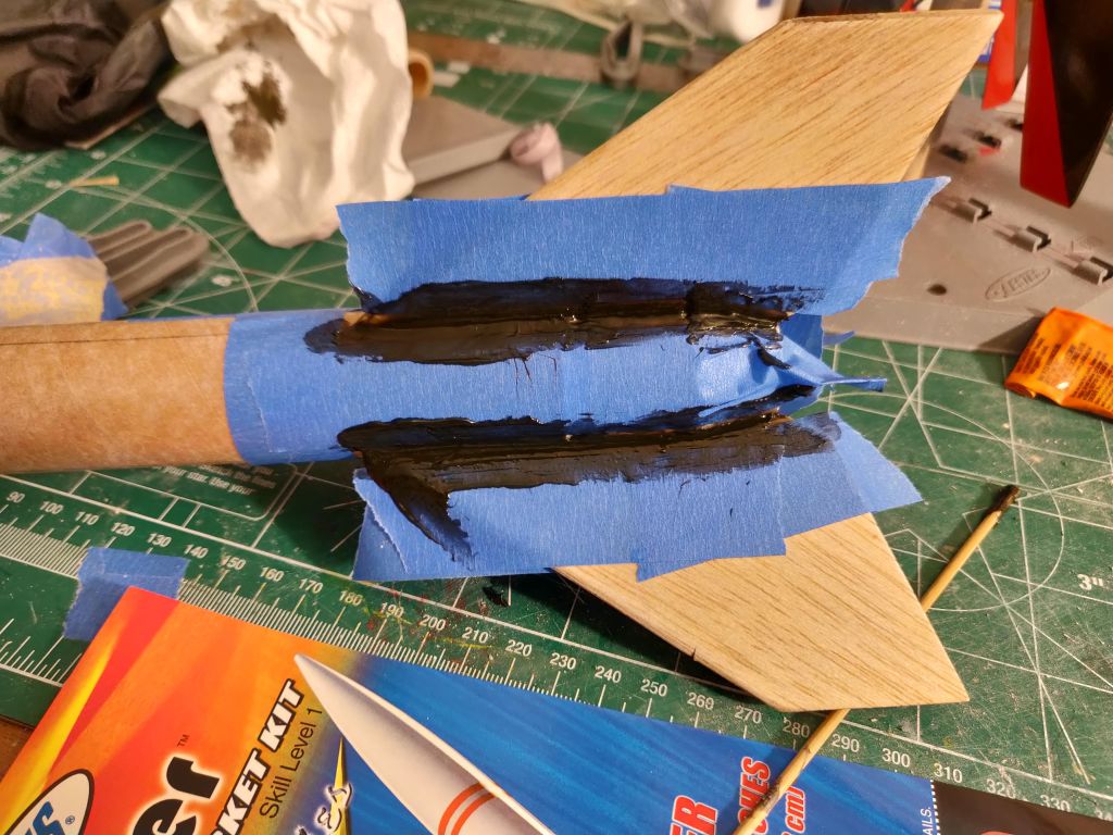 I glued and filleted the fins with Titebond, let them fully dry, then came back and added epoxy fillets. The fins on this rocket extend beyond the end of the body tube, so will be taking impact forces on landing. The epoxy fillets should further reinforce the fin attachment, as well as be visually appealing and provide some modest aerodynamic benefits. I first tried employing epoxy fillets on the Bertha’s Breech Baby build, in which I learned that masking first with blue painter’s tape allows you to get very neat fillets very easily.